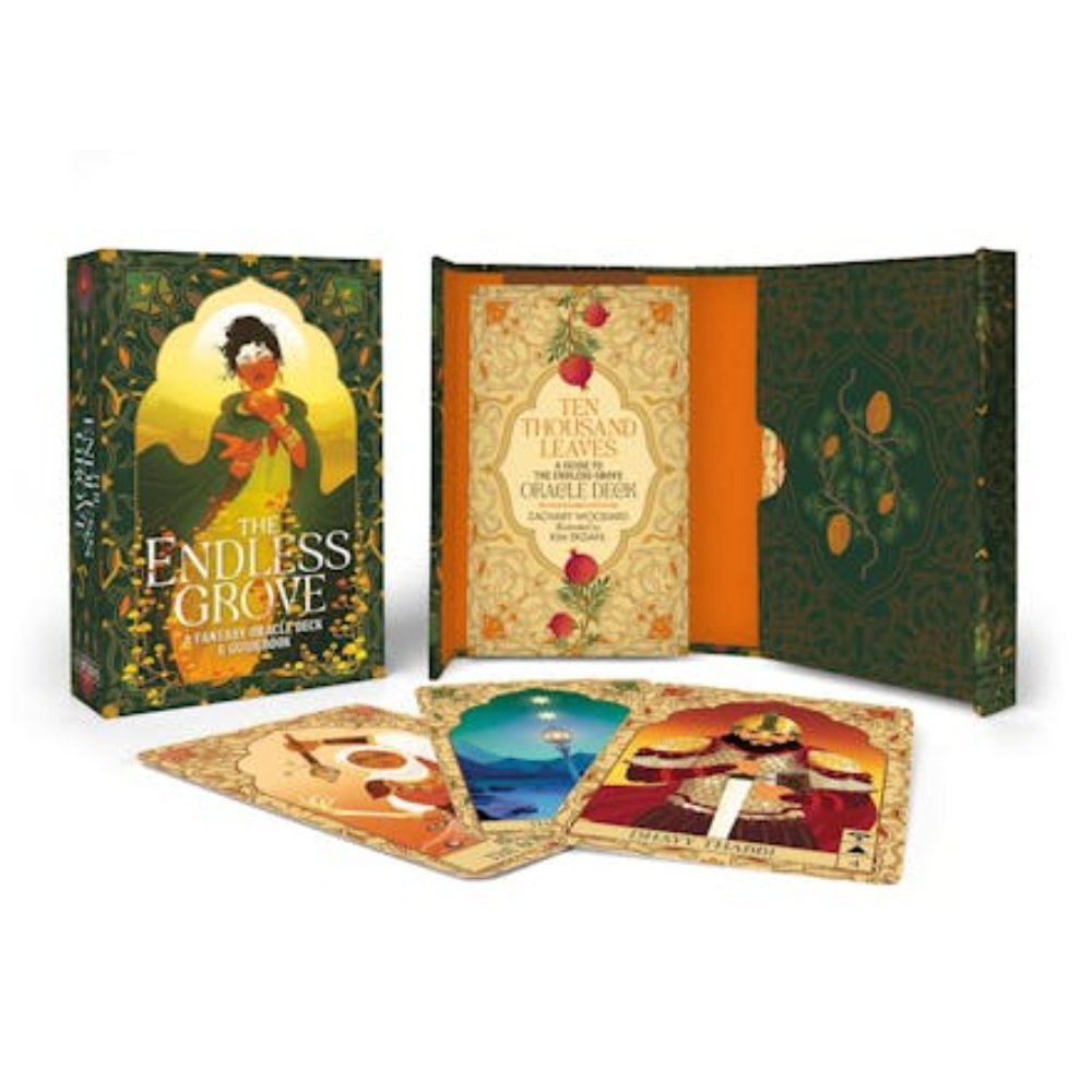 The Endless Grove is a one-of-a-kind oracle deck and guidebook inspired by Arabian mythology, folktales, and the storytelling tradition of myriorama (“many thousand views”). It invites readers into an Arabian-inspired fantasy world where caravans wander with spices and song, djinn test the devout, and poems decide the fates of heroes, mages, and beasts.